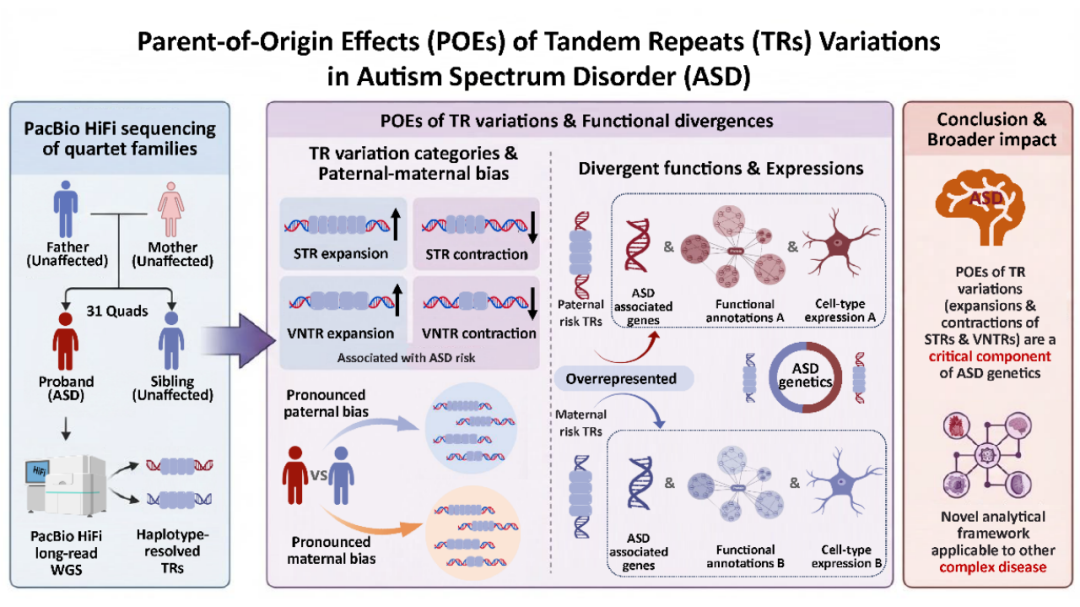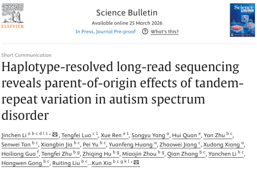 近日,儿科罕见病教育部重点实验室夏昆研究员、李津臣研究员、夏露副研究员在Science Bulletin上发表了题为“Haplotype-Resolved Long-Read Sequencing Reveals Parent-of-Origin Effects of Tandem-Repeat Variation in Autism Spectrum Disorder”(基于长读长测序解析孤独症单倍型水平串联重复变异的亲本来源效应)的研究成果(doi.org/10.1016/j.scib.2026.03.058)。该研究基于长读长测序技术,在单倍型水平解析了串联重复序列(TandemRepeat,TR)变异与孤独症谱系障碍(Autism Spectrum Disorder, ASD)的相关性及其亲本来源效应,为深入理解ASD的遗传基础提供了新视角。
